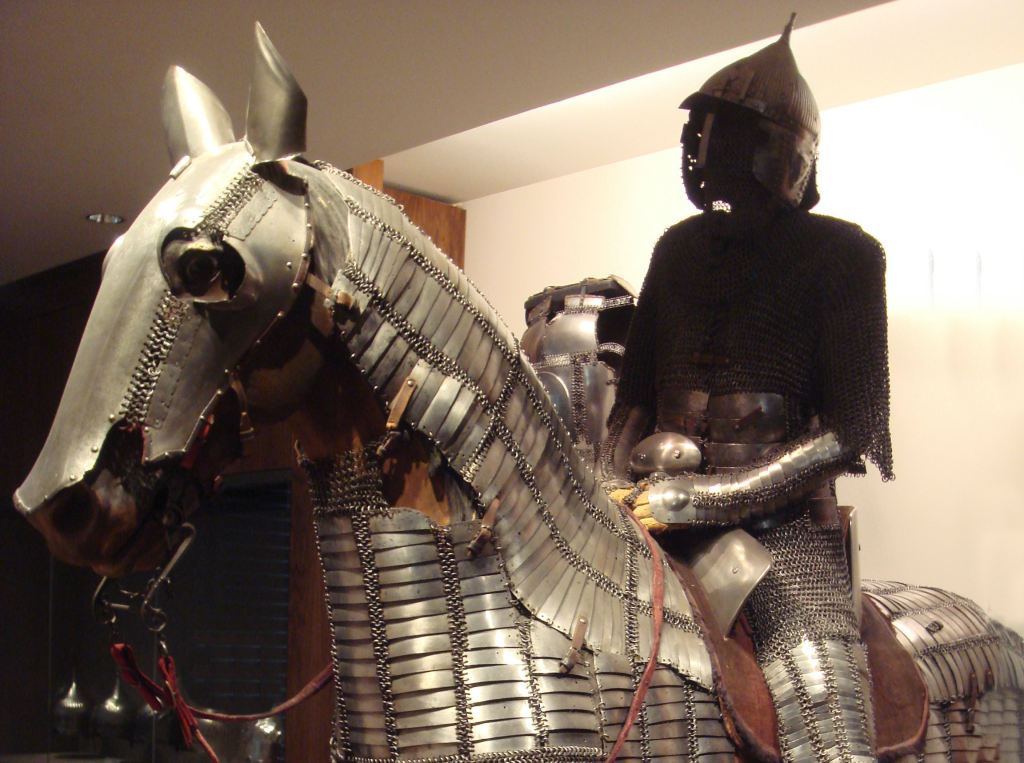 O conceito de Cavalaria Pesada vem da Idade Antiga: os Persas criaram a modalidade de Cavalaria conhecida como Catafractos*, com combatentes blindados da cabeça aos pés… e seus cavalos também — eles tinham armaduras próprias! Isso se tornaria padrão entre vários povos da antiguidade e, para tentar resumir o máximo possível**, chegaria à Idade Média e desembocaria na cultura da cavalaria desse período. Sim, a raiz do seu Cavaleiro de D&D veio daí!